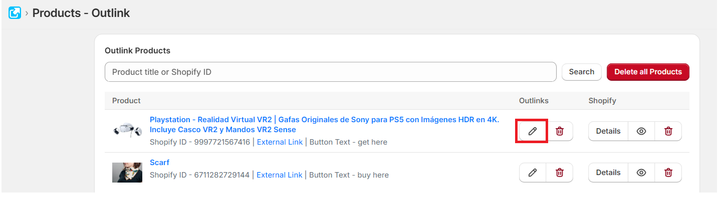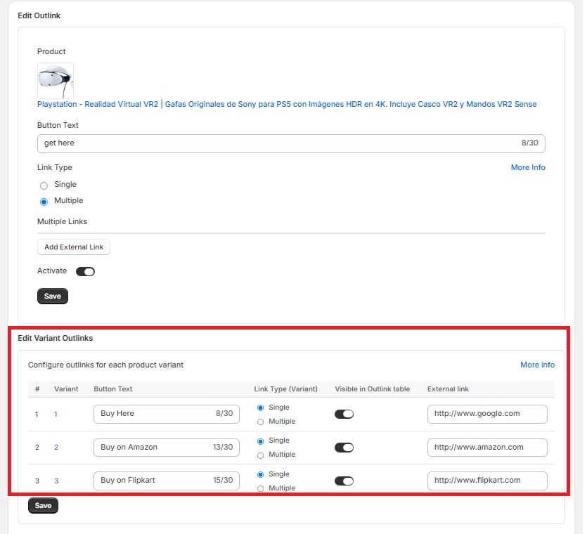 The app now supports adding external links to the variants of a product. To add a variant level link, click 'Edit' Outlinks for any product: