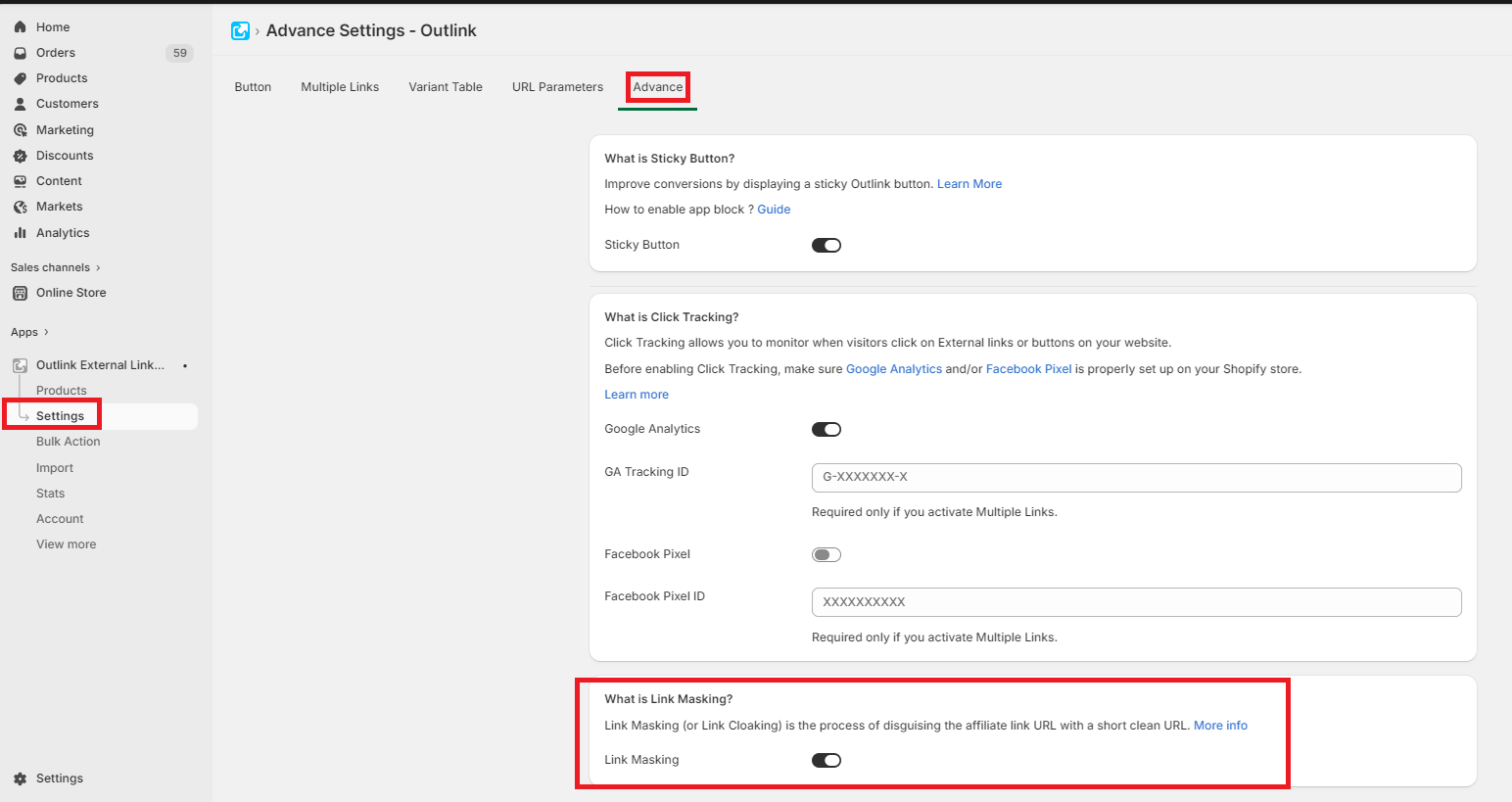To activate Link Masking, go to Outlink dashboard > Settings > Link Masking > Activate > Save.