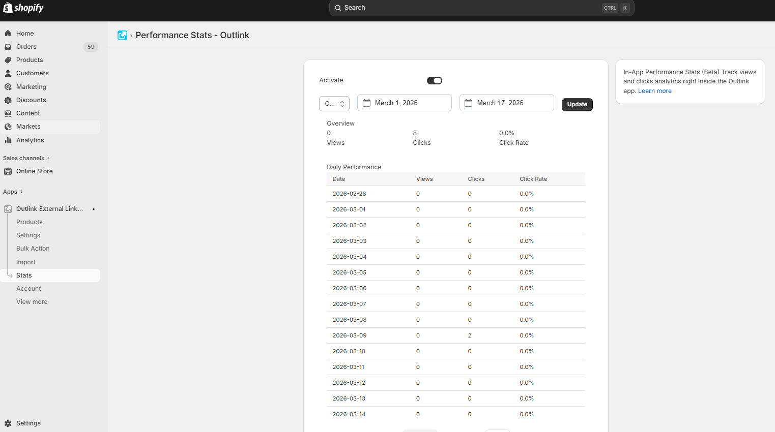 Use Outlink In-app Stats to track the performance of your affiliate/external Outlinks, right inside the app dashboard.