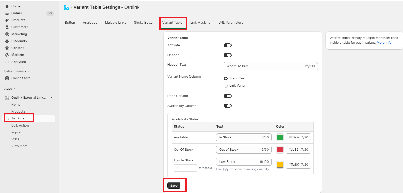 Step 1. Enable Variant table from Outlink App Dashboard