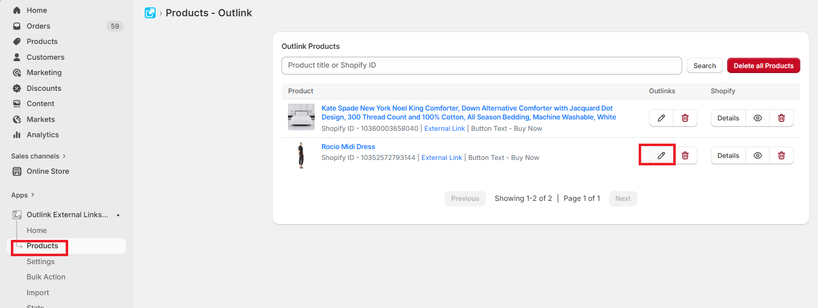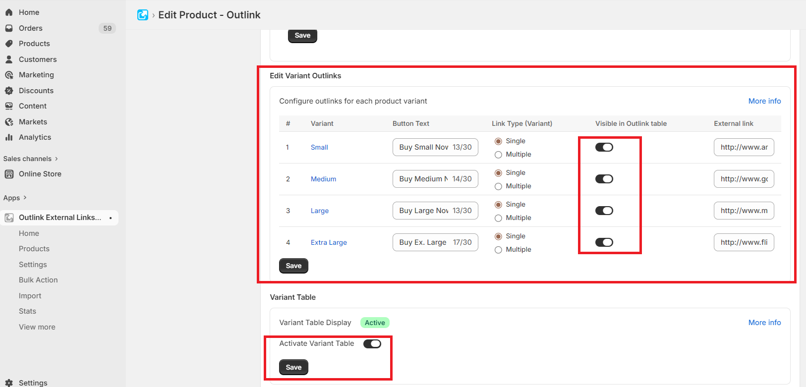 - Go to the Outlink Edit page for the product you wish to enable the table for. Add the external links for each variant and activate the Variant Table option.